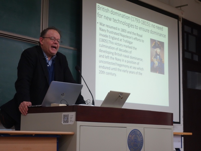 2017年12月11日-14日,应拼搏在线登录邀请,法国国家海军史研究中心首席专家、知名学者亚历山大•谢尔东-杜普莱教授(Alexandre Sheldon- Duplaix)前来北京师范大学讲学。12月12日上午,杜普莱教授走进“世界近代史”课堂,为拼搏在线登录2015级本科生作了题为“工业革命与世界海权(1789-1918)”的学术讲座。本次讲座系我校励耘学术讲堂历史学系列讲座之一,由历史学院世界近代史教研室江天岳博士主持,历史学院世界近代史教研室贾珺副教授等出席了讲座。前来聆听的还有来自北京师范大学和其他首都高校的学生和军事史爱好者。