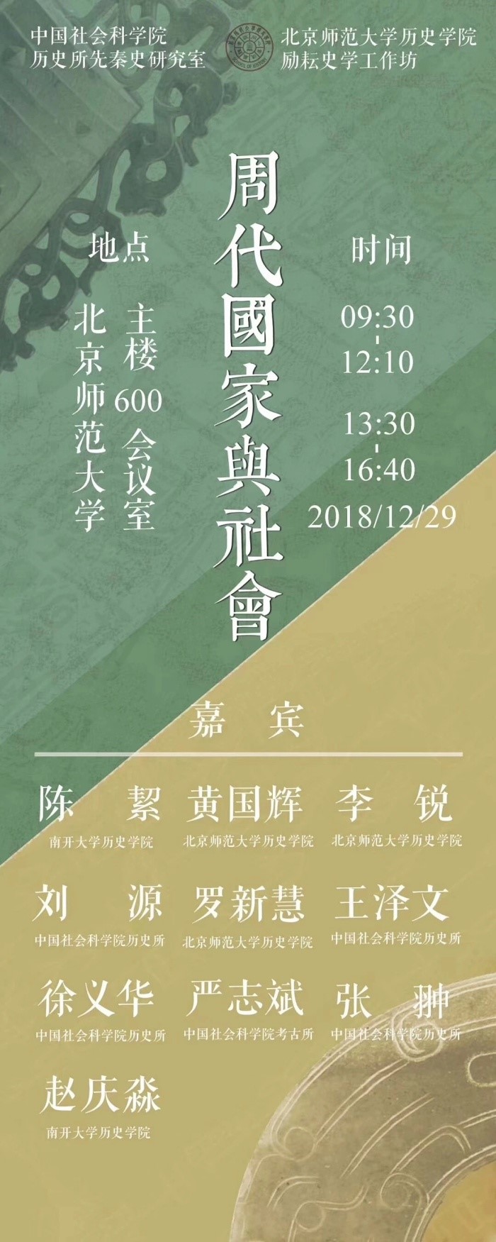 2018年12月29日,由拼搏在线登录和中国社科院历史所先秦史研究室联合主办的“周代国家与社会”学术研讨会在北京师范大学主楼600成功举办。中国社科院历史所研究员徐义华、刘源、王泽文、张翀,中国社会科学院考古所研究员严志斌,南开大学教授陈絜、助理教授赵庆淼,拼搏在线登录教授罗新慧、李锐、副教授黄国辉等10位青年学者共同出席了本次会议并作学术报告。来自社科院、南开大学和北师大的数十名本、硕、博同学也积极参与了本次会议。