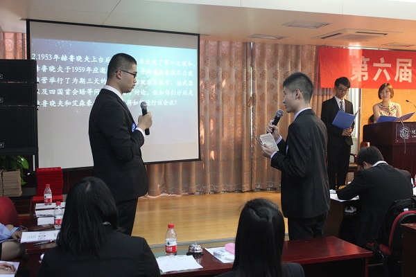 本次比赛共有北京师范大学、对外经贸大学、北京第二外国语大学、中国政法大学、国际关系学院、外交学院、中国人民公安大学和天津外国语大学等十二支代表队参加,共分“浮云在一决”“光影时刻”“读书破万卷”“狭路相逢勇者胜”和“飞花落国关”五个环节,比赛节奏紧张、扣人心弦。其中,第二环节“光影时刻”要求选手根据播放的视频或照片说出其对应的历史事件,王伟同学反应敏捷,立即答出正确答案“奥地利王位争夺战”,充分展现其丰富的知识储备,赢得热烈的掌声。第四环节“狭路相逢勇者胜”要求每队各派出一名选手,在某一特定的历史背景下扮演不同的政治人物,为争取本国利益的最大化而展开交锋。我校代表队派出刘泽元同学,模拟原美国总统艾森豪威尔,与赫鲁晓夫谈判。刘泽元同学陈述观点,理性分析,条理清晰,适当补充历史史实,将全场气氛推向高潮,受到一致好评。评委认为刘泽元同学扮演的艾森豪威尔“符合美国利益考量”,展现出对国际关系史问题良好的理解力与感受力。
