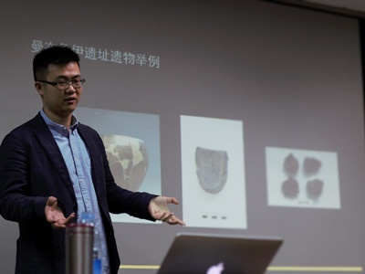 首先,丁雨老师向大家阐述了去肯尼亚考古的缘由。他指出,大使的关注、2005年“郑和下西洋”600周年纪念的到来以及政府与学界的高度关注等都是肯尼亚一行的重要原因。关于该项目实施的前期准备工作,由于学界在2005年提出了新的学术规划,同时伴随该项目的推进,肯尼亚考古工作很快就开始了正式的发掘。之后,丁雨老师向大家着重介绍了发掘工作和相关聚落概况。肯尼亚的考古工作历时三年,主要发掘地点包括五处,丁雨老师就其中的曼布鲁伊遗址和马林迪老城遗址向大家做了详细说明。在对曼布鲁伊遗址的发掘中,发现了大量瓷器及少量的“永乐通宝”钱币。这也为学界论证郑和下西洋曾经到过东非提供了更多的可能性证据。在介绍完该遗址发掘物之后,丁雨老师对该遗址的分期以及聚落状况做了一定的介绍,指出了该聚落“先由内陆到海边拓展,再由扩张到缩小”的特点。相比对曼布鲁伊遗址的介绍,丁老师对马林迪遗址的介绍则要简练一点,主要包括发掘地点的分布和出土文物的介绍。