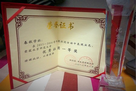 在盛典的领奖环节中,现任社长白月代表学社上台领奖。台下,社员们无不热情鼓掌,每个人都为学社取得的成绩而高兴。回首上一学年,学社生活忙碌而充实。参观海昏侯墓,举办读书会、讲座,复刊《春秋学刊》,开展“燕归来”外场活动,参与国子监祭孔。各种活动精彩纷呈,这些都展示着春秋学社的力量与凝聚力。社长和部长们的鼓励和希冀,都激励着社员们完善自我、不断向前。
