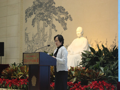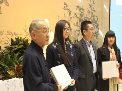 随后工作人员为大家宣读了著名历史学家章开沅先生的书面致辞,章先生在致辞中对基金会不吝赞美之词,对书籍出版工作表示高度的认同。嘉宾致辞结束之后,副主席杭元祥先生向宫崎家赠送文物,同时宫崎家也向中国宋庆龄基金会赠送了文献资料。互赠资料之后,纪念会便进入了最后一项仪式:新书揭幕。在场各位嘉宾共同为新书揭幕。同时,各位嘉宾向与会高校学生代表赠书,春秋学社孙悦代表我院接受馈赠新书并与宫崎黄石先生合影留念。