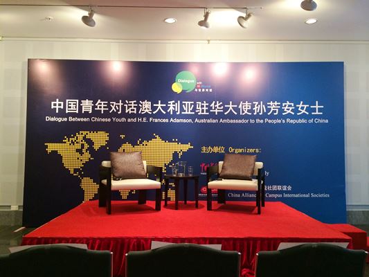 5月21日下午,应澳大利亚驻华大使馆邀请,我院学生和北京市15所高校学生代表赴澳大利亚大使馆参观,与澳大利亚驻华大使孙芳安女士(Ms. Frances Adamson)围绕“全球视野下的中澳青年交流”展开别开生面的对话。