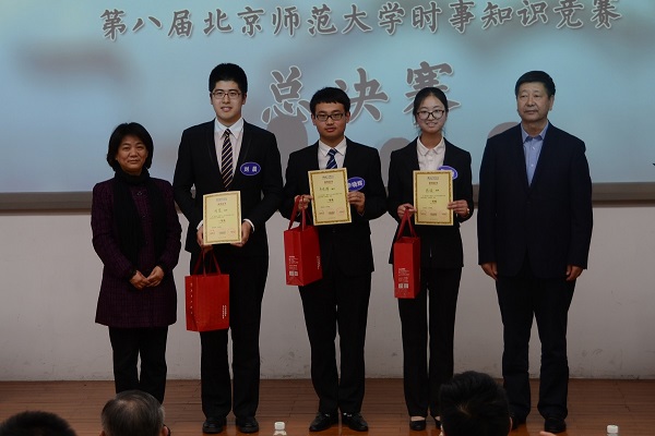 我校副校长周作宇老师,党委组织部部长方增泉老师,党委宣传部新闻中心常务副主任、机关一总支书记李美仙老师,教务处处长郑国民老师,辅导员基地执行副主任王显芳老师,北京师范大学教育基金会秘书长张吾龙老师,社科处副处长周晓旭老师,研究生工作处副处长严帅老师,本科生工作处副处长韩舰老师,校报主编周雪梅老师;历史学院院长杨共乐、分党委书记郭家宏、分党委副书记王卓凯,历史学院世界近代史教研室陈奉林,世界现代史教研室主任、“形势与政策”小组指导教师安然,世界近代史教研室主任庞冠群,世界近代史教研室贾珺,世界上古中古史教研室武晓阳,世界现代史教研室王广坤,史学理论与中国史学史教研室曲柄睿,外国语言文学学院蒋元群老师;地理科学学部分党委副书记王颖老师,信息科学与技术学院分党委副书记王学松老师,哲学学院分党委副书记罗松涛老师,法学院分党委副书记原茵老师,校研究生会主席杜德建同学等也出席了当晚的决赛。出席本次比赛的还有国际关系学院、清华大学、北京大学、外交学院、南开大学、北京理工大学、北京航空航天大学、对外经贸大学、中国人民大学、台湾交通大学、韩国首尔大学、韩国成均馆大学等院校时事团体的负责人和学生代表。