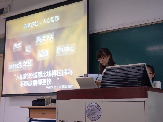 近日,在马克思主义学院分党委书记张润枝老师的安排下,我院同学再次承担了《思想道德修养与法律基础》课程的特色授课任务,连续第9年为全校本科生集体授课。至此,我院已有10个年级的学生先后36次走上讲台。 6月15日下午,我校100多名2014级本科生在教二101欣赏了一堂别开生面的《思想道德修养与法律基础》课程。历史学院2014级本科生、“形势与政策”小组成员朱丁睿同学走上讲台,用丰富活泼的形式对当下时事热点进行了生动讲解。朱丁睿同学授课的主题是《看不见的威胁:全球视野下流行性病毒案例反思》。在短短20分钟的时间里,她以埃博拉病毒的爆发为切入点,回顾了甲型H1N1流感肆虐的情况,分析了近几年流行性病毒肆虐的原因以及各国采取的措施等。她最后指出,我们要反思人与自然的关系,加强各国科技合作,发挥国际组织的作用,坚定共同抗击病毒的信心。