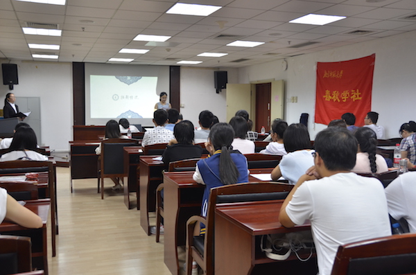 9月14日晚8:30,春秋学社于主楼600召开了新学年的第一次全员大会,本次大会由公关外联部部长孙悦主持,出席本次大会的嘉宾有春秋学社学术指导教师、历史学院副教授黄国辉老师,分团委书记胡小溪老师,专职辅导员李力老师以及学院各兄弟社团负责人。春秋学社第31届、32届社员作为嘉宾到场,与新社员们交流经验。 副社长范沛沛向到场嘉宾和新社员介绍了春秋学社本学年的招新情况:本次招新工作顺利进行,共招收2016级新干事32名。