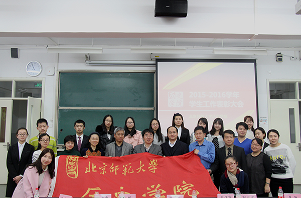 大会首先由姜海军老师宣读2015-2016学年本科生国家奖学金、国家励志奖学金、京师奖学金、专项奖学金、社会奖学金以及三好学生等荣誉称号获得者名单;李帆老师宣读2015-2016学年研究生国家奖学金、学业奖学金、专项奖学金、社会奖学金等荣誉称号获得者名单。随后进行大会第二项,郭家宏老师宣读白寿彝史学论著奖本科生组获奖名单。大会第三项流程是2016年度学生工作颁奖,在播放历史学院2015-2016学年学生工作回顾展示视频后,王卓凯老师宣读了各项国家级、市级及校院两级学生工作教师、集体类奖项获奖名单;湛晓白老师和朱敏老师分别宣读了校级和学院学生工作获奖学生名单。院长杨共乐老师、副院长李帆老师、副院长姜海军老师、分党委副书记王卓凯老师、世界近代史教研室主任郭家宏老师为获奖代表颁奖,并与获奖代表合影留念。