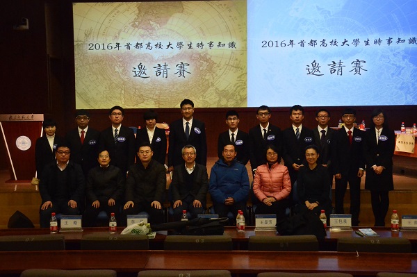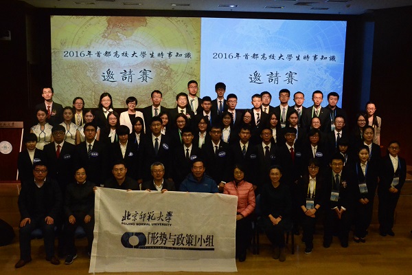 当天下午,2016年首都高校大学生时事知识邀请赛总决赛在我校京师学堂京师厅举行。北京高校形势与政策教育研究会副理事长教育部高校辅导员培训和研修基地(北京师范大学)执行副主任王显芳老师,北京高校形势与政策教育研究会副理事长、北方工业大学马克思主义学院形势与政策教研室主任王包泉老师,北京科技大学学生工作部部长于成文老师,北京交通大学学生处副处长王皓老师,中央民族大学形势与政策研究室主任李泓老师,河南师范大学历史学院分党委书记王霞老师,我院分党委副书记王卓凯老师作为嘉宾出席本次活动。此外,出席今天活动的还有来自国际关系学院、北京航空航天大学、北京理工大学等参赛高校的学生代表和亲友团成员。