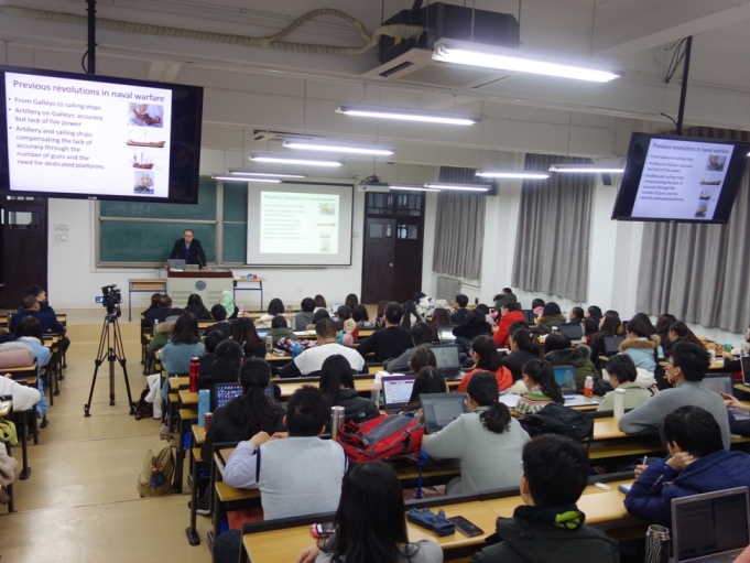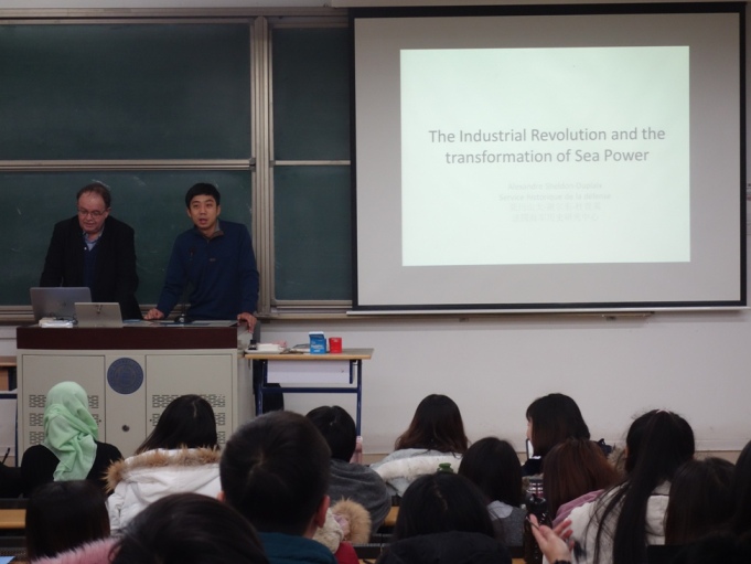 2017年12月11日-14日,应拼搏在线登录邀请,法国国家海军史研究中心首席专家、知名学者亚历山大•谢尔东-杜普莱教授(Alexandre Sheldon- Duplaix)前来北京师范大学讲学。12月12日上午,杜普莱教授走进“世界近代史”课堂,为拼搏在线登录2015级本科生作了题为“工业革命与世界海权(1789-1918)”的学术讲座。本次讲座系我校励耘学术讲堂历史学系列讲座之一,由历史学院世界近代史教研室江天岳博士主持,历史学院世界近代史教研室贾珺副教授等出席了讲座。前来聆听的还有来自北京师范大学和其他首都高校的学生和军事史爱好者。