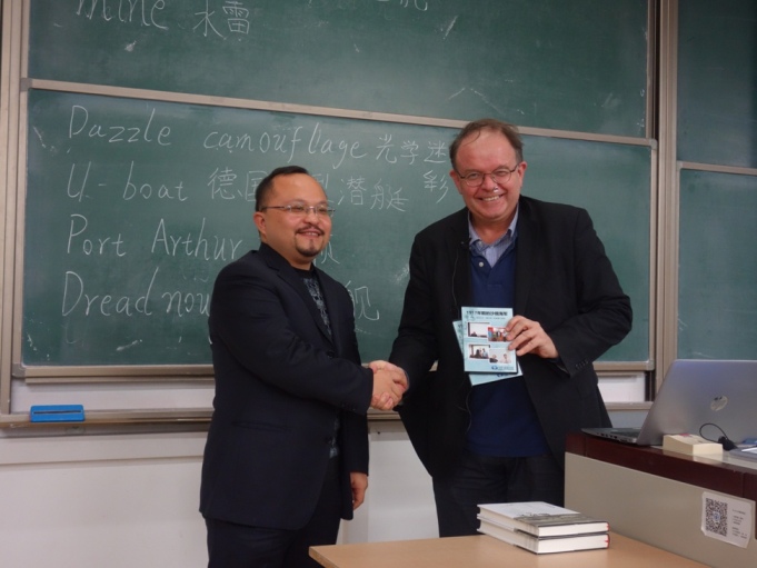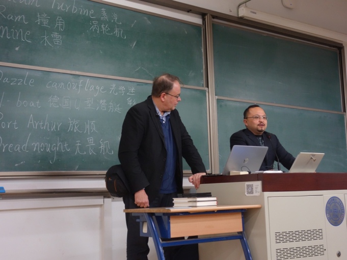 在一个半小时的英语讲座中,杜普莱教授结合自身最新研究成果,从军事史、技术史的角度展现了工业革命以来的海军技术革新和世界海上力量的变化,揭示了海权对国家长治久安的重要意义。讲座结束后,贾珺副教授对杜普莱教授的演讲进行了精彩的点评。他指出,杜普莱教授通过介绍技术进步对于19世纪海权演变的重要作用,对“世界近代史”课堂教学中涉及的两次工业革命、拿破仑战争、克里木战争、意大利统一、德意志统一、美国内战、第一次世界大战等重大历史事件进行了有效的串联、梳理和补充,不仅丰富了课堂教学形式和内容,而且锻炼了同学们的英语能力,让大家受益匪浅。贾珺副教授代表历史学院世界近代史研究中心,感谢杜普莱教授为我校师生带来一场高水平的学术讲座,并向杜普莱教授赠送了军事史书籍和讲座光盘等纪念品。