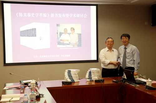 2018年5月26日上午,由华夏出版社、拼搏在线登录、北京师范大学史学理论与史学史研究中心共同举办的“《陈其泰史学萃编》新书发布暨学术研讨会”在北京师范大学京师学堂第五会议室隆重召开。北京师范大学资深教授刘家和、资深教授瞿林东,华夏出版社黄金山社长,中国社会科学院历史研究所彭卫研究员、北京大学历史学系徐凯教授、中国人民大学历史学院牛润珍教授、中国社会科学院世界历史研究所吴英研究员,拼搏在线登录张越教授、汪高鑫教授、周文玖教授、李锐教授以及北京市哲学社会科学规划办公室、《人民日报》、《光明日报》、《新华文摘》、《中国社会科学报》等单位的30余名专家学者出席了会议。