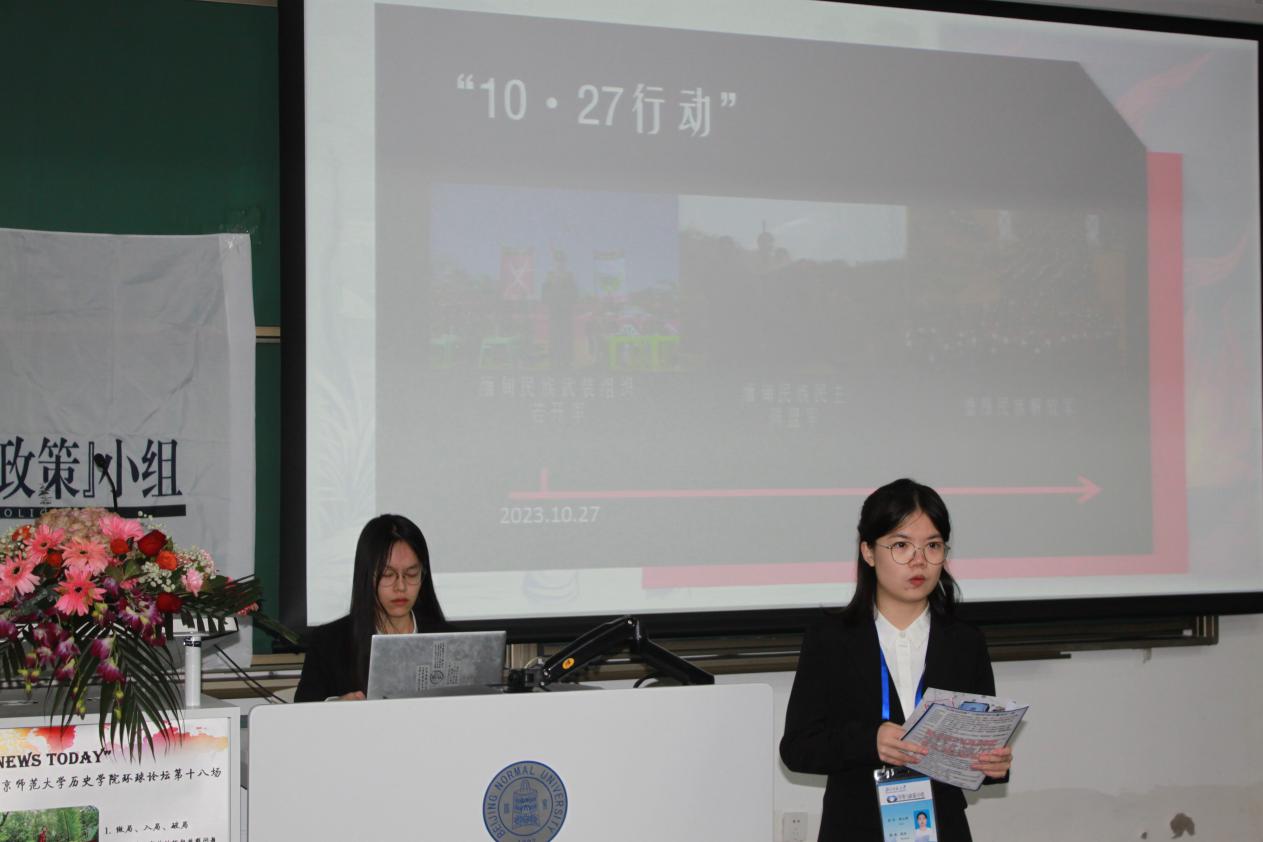 第一组代表、历史学院2023级本科生林心妍以《做局、入局、破局——隐于密林的缅甸族群问题》为题进行展示。主讲人从10月27日缅甸武装冲突切入,介绍了缅甸近代以来的发展与走向。历史学院国际关系史教研室刘少楠老师对缅甸国父昂山及其女昂山素季在缅甸民主进程中扮演的角色进行补充讲解,指出了缅甸族群问题中的变与不变,对大家学习研究第三世界国家历史提出中肯建议。