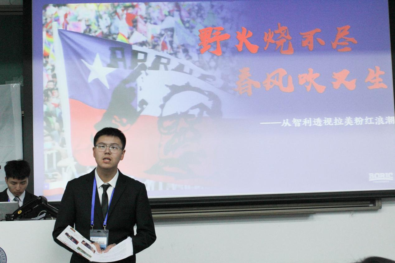 第二组代表、历史学院2023级本科生吴自嵘以《野火烧不尽,春风吹又生——智利与拉美粉红浪潮》为题进行展示。主讲人以智利总统博里奇访华经历为切入点,重点回顾了世纪之交拉美粉红浪潮、智利人民阵线成立、智利前总统阿连德改革与皮诺切特政变等历史事件,并对拉美国家的发展前景进行展望。历史学院现代史教研室主任安然教授充分肯定了第二组同学清晰的叙事脉络和完整的讲解逻辑,并以智利历史不同时期经济、政治政策的比对为例拓展了同学们观照历史的视角,强调了智利在拉丁美洲国家中的特殊情况,带领大家进一步思考历史的复杂性与客观性。