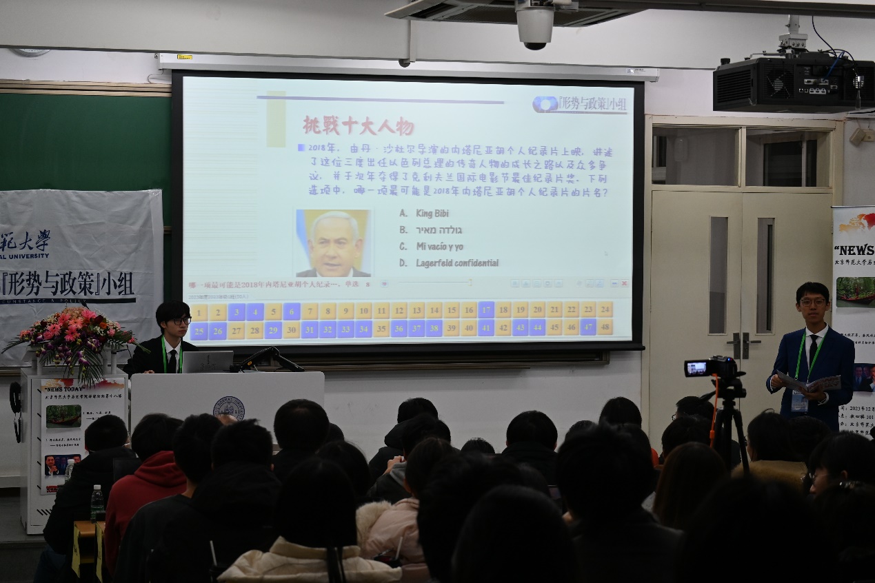 活动中,赵云慧揭晓了我校学生自主评选的“2023十大环球风云人物”。展示期间还穿插进行了“人物迷踪”、“挑战十大人物”等知识性与趣味性兼备的时事知识互动环节,通过游戏的形式引导同学们关注国内外时事、拓宽国际视野。