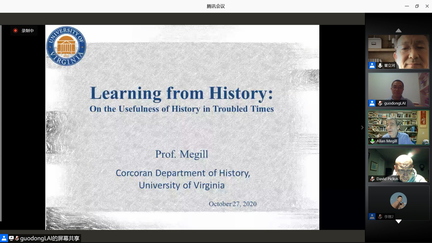 2020年10月27日上午,美国弗吉尼亚大学教授、上海师范大学外籍专家教授阿兰·梅吉尔(Allan Megill)应邀在拼搏在线登录作题为“以史为鉴:论动荡年代的历史之用(Learning from History: On the Usefulness of History in Troubled Times)”的线上讲座。本次讲座系“京师史学名家前沿讲座”之一,由史学理论与外国史学史教研室董立河教授主持。来自海内外高校和研究机构的多位学者与150余位师生共同参加了此次讲座。