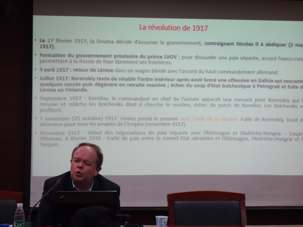 5月27-30日,应拼搏在线登录邀请,法国国家海军史研究中心首席专家、知名学者亚历山大.谢尔东-杜普莱教授(Alexandre Sheldon- Duplaix)来我校访学。5月29日下午,杜普莱教授在主楼600会议室作了题为“1917年前的沙俄海军”的学术讲座。本次讲座系我校励耘学术讲堂历史学系列讲座之一,也是纪念俄国十月革命100周年专题学术活动的重要部分。讲座由历史学院世界近代史教研室江天岳博士主持,历史学院世界近现代史研究中心主任张建华教授、世界现代史教研室主任安然老师、世界现代史教研室王广坤老师等出席了讲座。