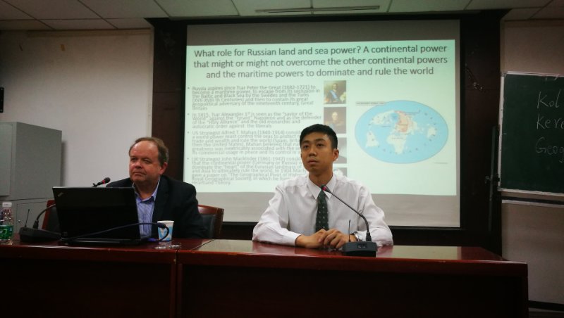 最后,杜普莱教授紧扣沙俄海军的主题作了精炼的总结:沙俄本是一个大陆国家,但在近代以来长期追求海权,在与英法等列强长期较量中暴露出自身许多问题,最终导致社会革命。教授介绍说,一些战略家总结陆权与海权的关系,或许可以帮助我们理解这一问题:美国军事理论家马汉(Alfred T. Mahan,1840-1914)认为,世界强国必须控制海洋来保护海上贸易和财富,进而统治世界。英国地缘政治家麦金德(Halford J. Mackinder,1861-1947)则提出“陆心说”,认为陆上强国将主宰欧亚大陆核心地区,最终统治世界。在这个开放性的问题上,杜普莱教授深厚的历史思辨与宽广的历史视野给同学们以深刻启迪。