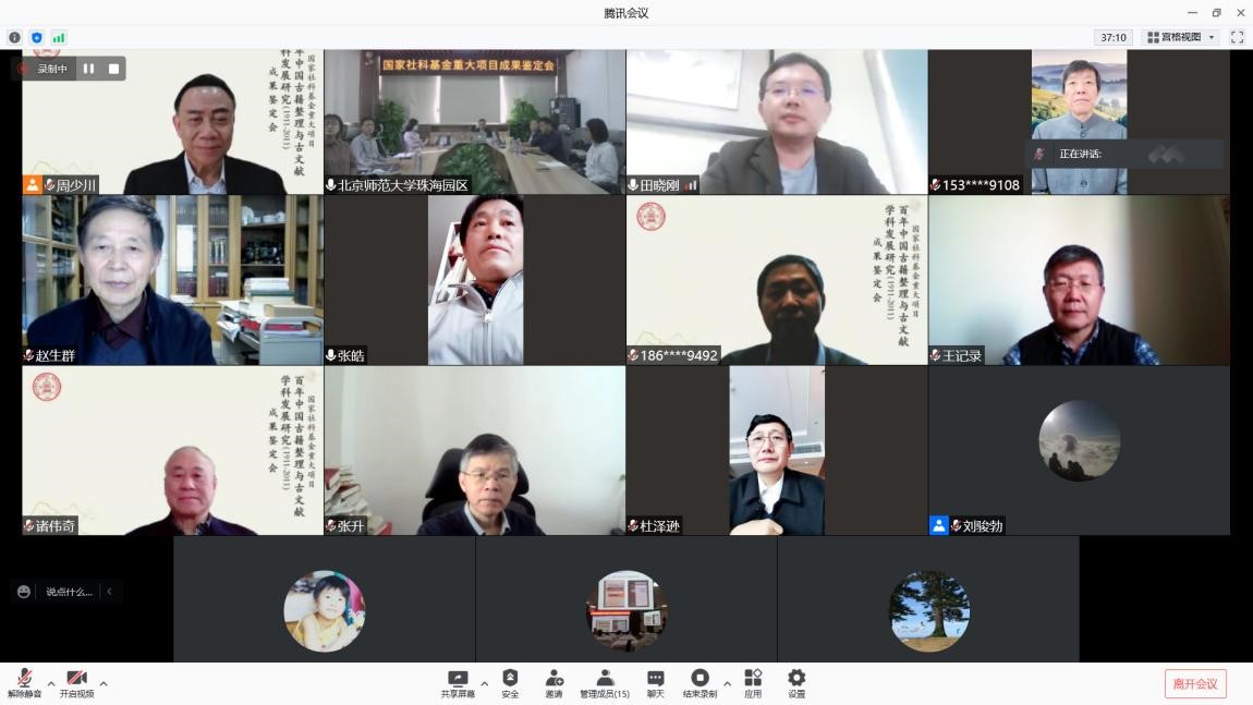 2021年11月14日上午,由拼搏在线登录周少川教授担任首席专家的国家社科基金重大项目“百年中国古籍整理与古文献学科发展研究(1911-2011)”成果鉴定会通过“线上”“线下”相结合的形式召开,线下会场设在北京师范大学珠海校区。专家鉴定组由组长、中国历史文献研究会会长、南京师范大学文献与信息学系主任赵生群教授,清华大学出土文献研究中心副主任刘国忠教授,全国古籍整理出版规划领导小组成员、山东大学文学院院长杜泽逊教授,国家清史编纂委员会典志组专家、中国人民大学清史所黄爱平教授,华中师范大学国学院常务副院长、历史文献研究所董恩林教授等五位专家组成。